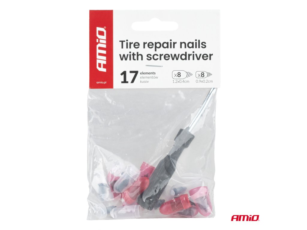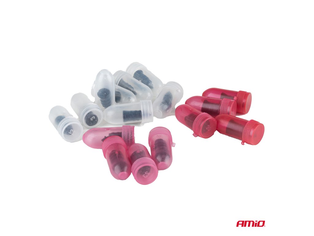 Vulkanizačné skrutky AMiO sú určené na jednoduché utesnenie defektov spôsobených klincami alebo skrutkami. Vďaka kombinácii železného jadra a gumového povrchu sa skrutka pevne usadí v pneumatike a spoľahlivo zabráni úniku vzduchu. Súprava obsahuje dva rozmery skrutiek a ergonomický skrutkovač, vďaka čomu je použitie rýchle, intuitívne a efektívne.