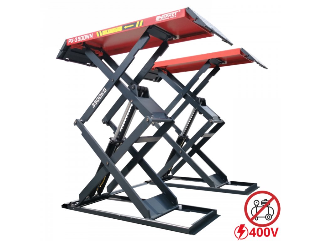 Normet PX-3500WNE je vysokozdvižný nožnicový zdvihák navrhnutý pre intenzívnu dielenskú prevádzku. Kontštrukcia umožňuje jednoduchú montáž na podlahu, pritom ponúka veľkorysý zdvih pre pohodlný prístup k podvozku, brzdám aj výfukovej sústave. Synchronizovaný chod, elektromagnetické bezpečnostné zámky (nepotrebuje prívod vzduchu k odisteniu) a spoľahlivá elektrohydraulika prinášajú istotu pri každodennej práci. Nízky profil plošín a plynulý nájazd šetria čas. Robustné čapy, kvalitné klzné prvky a prehľadné ovládanie