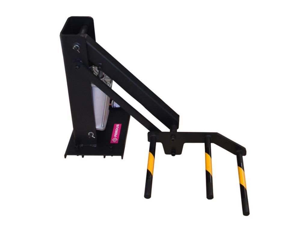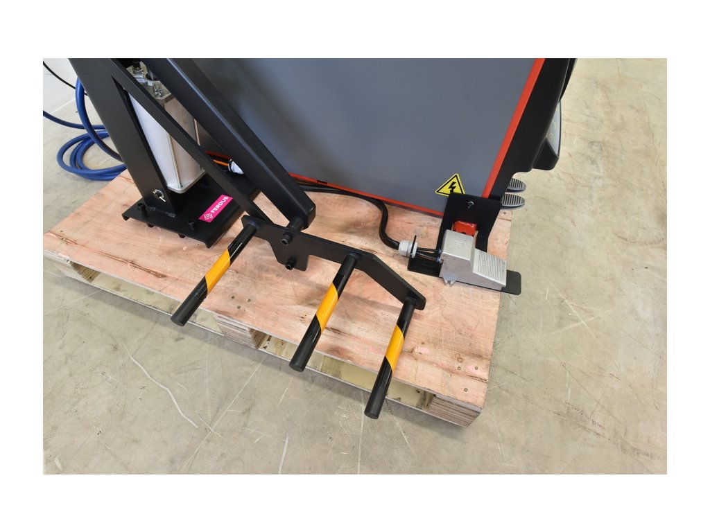 Pneumatický zdvihák ovládaný nožným pedálom umiestnený na ľavej strane montážneho stroja. Slúži na zdvihnutie kolies do výšky pracovného stola montážneho stroja.